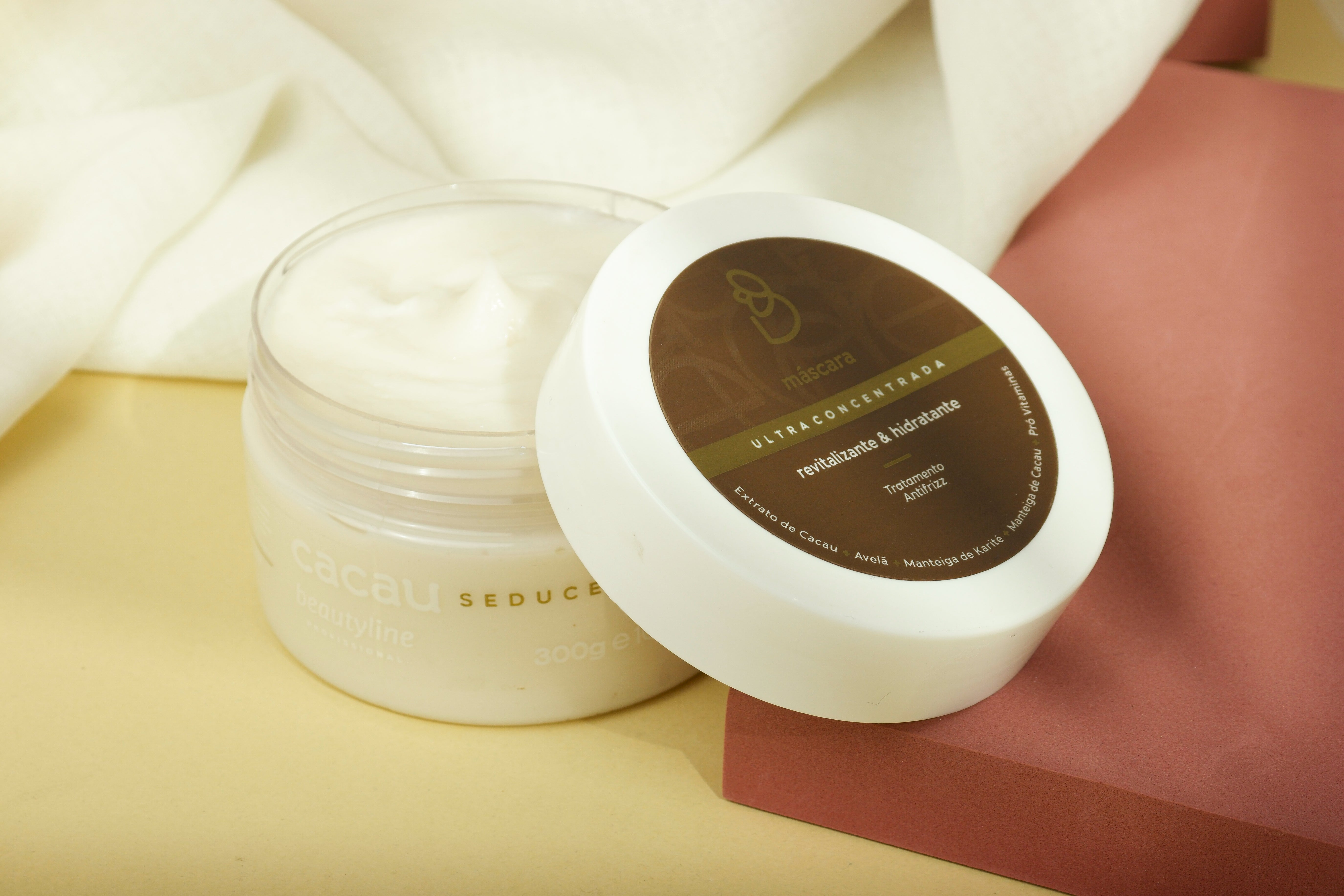 Extrato de Cacau, Açaí, Manteiga de Karité, Pró-Queratina.
